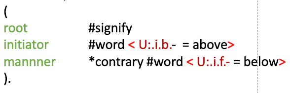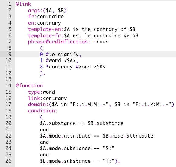 In IEML, semantic relations are not created one by one « by hand » but are programmed. The instruction for creating semantic relations below is broken down into two parts. In the example below, the part that starts with @link states the link sentence with the two variables $A and $B: « Word A means the opposite of word B ». The numbers 0, 1 and 8 are shortcuts for the sentence roles: root, initiator and manner. The part that begins with @function states the domain (in this case the spatial relation paradigm above) that is concerned with relation creation. It states the necessary conditions for the creation of relations in terms of syntactic addresses and content. The function for creating relations uses only two types of « equations » connected by « AND » and « OR »: