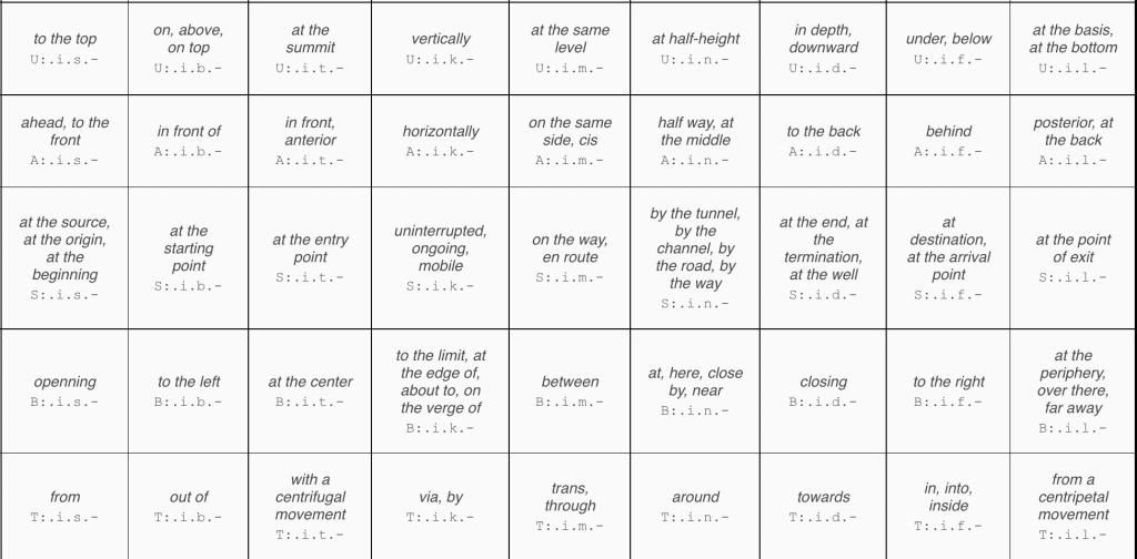 IEML words paradigms (and sentences paradigms as well) are systems of semantic symmetries represented by systems of syntactic symmetries. For example, the paradigm below organizes spatial relationships. The first two rows organize spatial relationships along the vertical (first row) and horizontal (second row) axes. The three rows at the bottom of the table organize entry and exit, lateralization, and pathways.