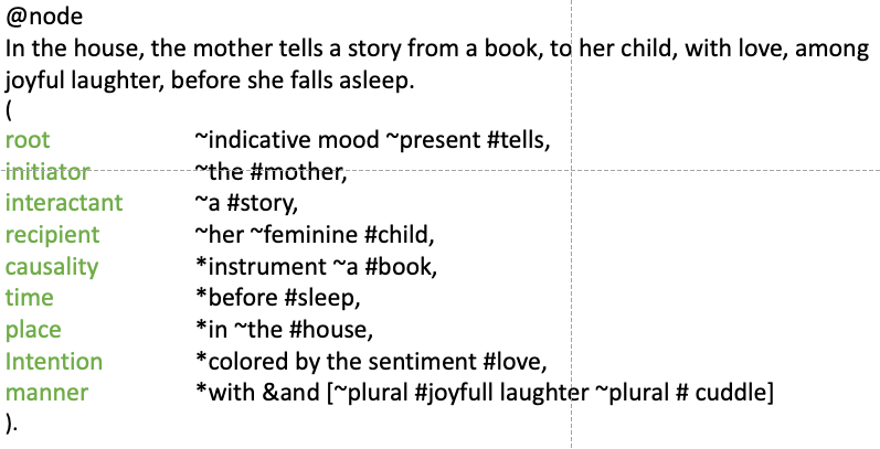 The nine roles of the sentence – in green in the example – along with *auxiliaries, ~inflections and & junctions allow for the expression of narratives and causal explanations.