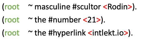 IEML explicitly handles proper names and references that are not general categories. The example below gives three examples: a name, a number and a hyperlink. To learn more about the treatment of proper names in IEML see: https://intlekt.io/proper-names-in-ieml/