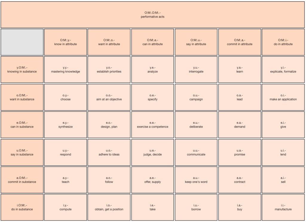 The respective positions of the words on the tables display as much as possible their semantic relations. At a glance, the paradigmatic tables show the words most related to each other, like those on the same row, on the same column or those that appear linked by various symmetric patterns, like an exchange of substance and attribute on the diagonal. An example of the way formal symmetries between words of the same paradigm correspond to semantic symmetries is the relation between y.u.- « to question » and u.y.- « to respond », in the above Table 2 of « performative acts ».