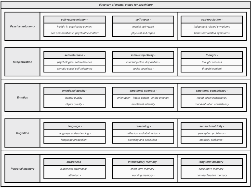 I used the fundamental symmetries of IEML to order the universe of discourse of mental health symptoms. The top row corresponds to the emergent qualities of the psyche in its most virtual dimension (autonomy) while the bottom row corresponds to the most actual dimension, which concretely supports the other psychic functions (memory). Between these two dimensions, the ascending and descending information is coded and decoded on a subjective (sign), emotional (being) and cognitive (thing) mode, as we see in the three intermediate rows. The three columns of the table correspond roughly to a sign / being / thing partition and the binary subdivision within each of the fifteen rectangles corresponds to a division between the most virtual aspects (for the top cell) and the most actual (for the bottom cell).