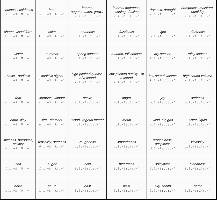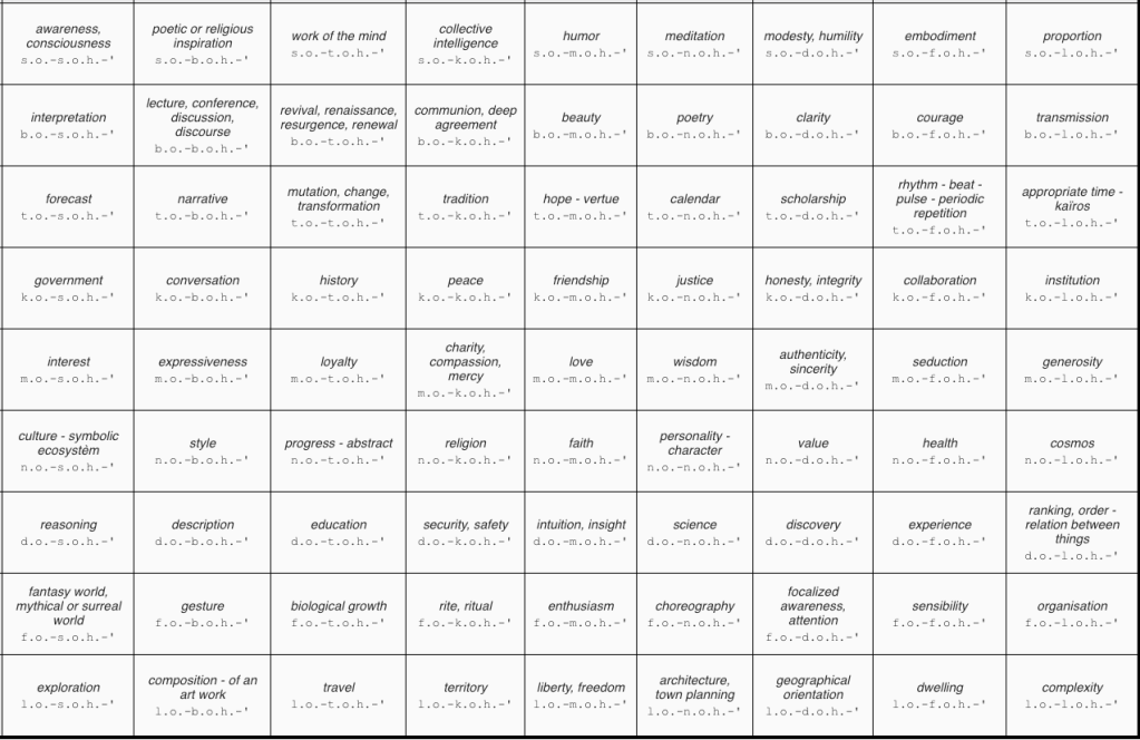 - The 9 rows correspond to the concepts represented by the nine lower-case letters (See Table 1 one on this page): reflection (s.), language (b.), memory (t.), society (k.), emotion (m.), world – name / infuse with values / transform through work – (n.), truth (d.), life (f.) and space (l.).