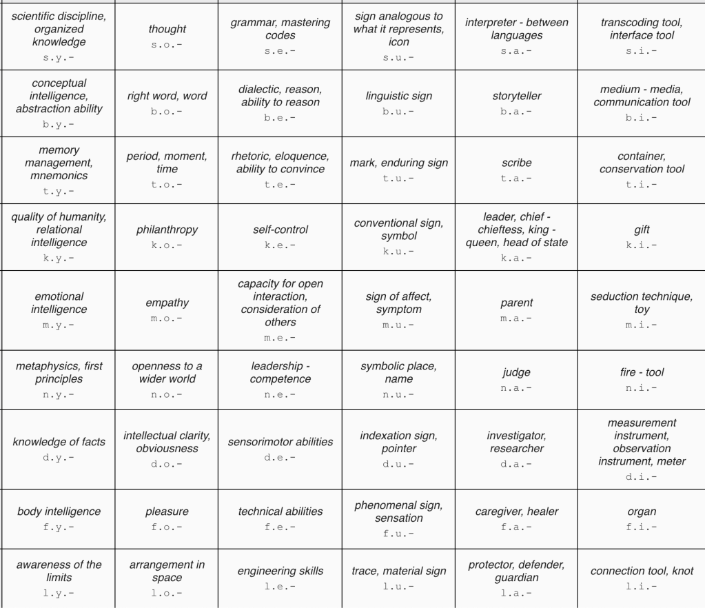 - The 6 columns correspond to different types of knowledge/intelligence (y.), types of values and desires (o.), types of skills or competencies (e.), types of signs (u.), broad social roles (a.), and main technical functions or tools (i.). See the yellow area on Table 2 on this page.