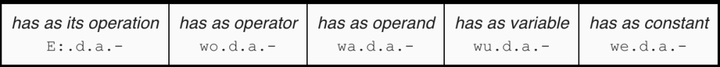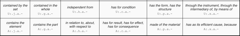 Table 1: set/element, part/whole, cause/effect, matter/form, relation, instrumentation.