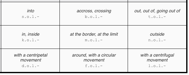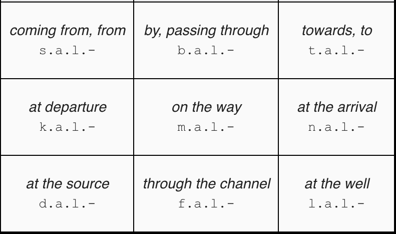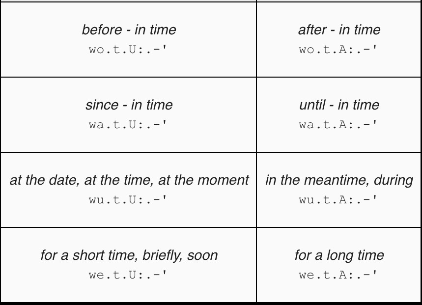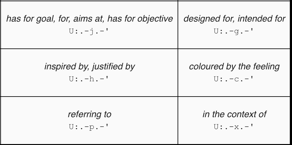 Prepositions (also called auxiliaries) precise the grammatical roles of causality, time, place, intention and manner.