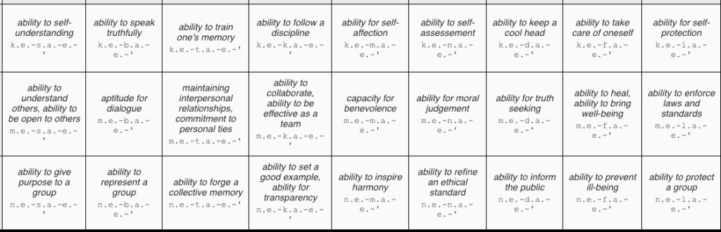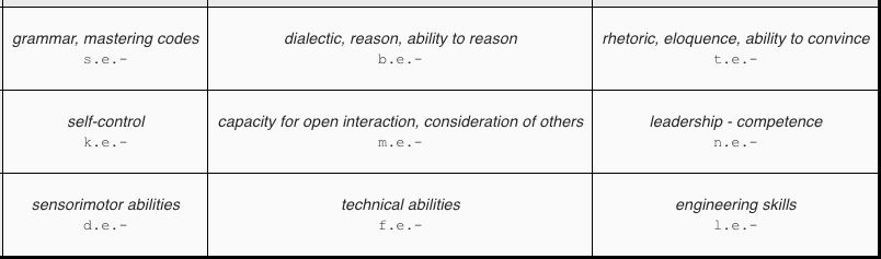 The following tables develop these basic skills and establish a correspondence between the skills and their objects. The three rows correspond to grammar, dialectic and rhetoric. The nine columns correspond to Table 4 (see the 25 lowercase letters for an explanation)