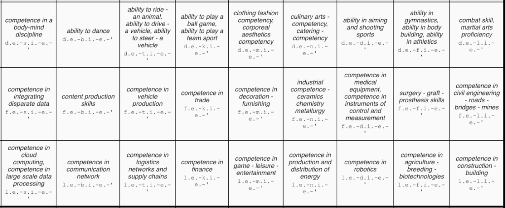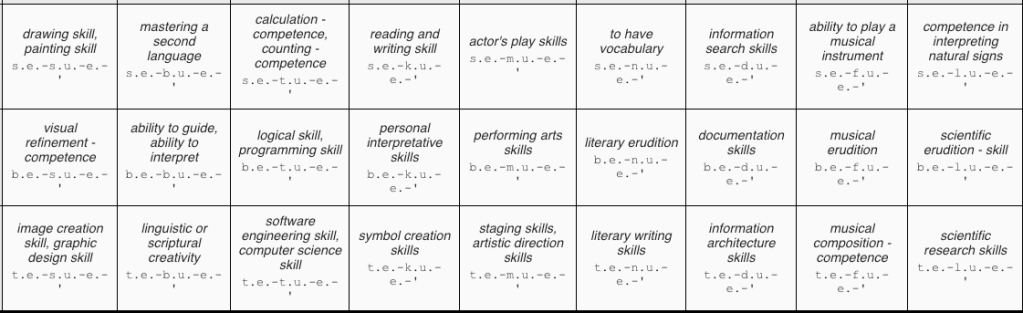 The main types of skills are described in the following table, corresponding to the 3rd column of table 1 of the transversal concepts page.
