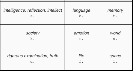 In Table 3, the rows correspond to, respectively, sign (1st row), being (2nd row) and thing (3rd row) related skills. The columns correspond to grammar (first column), dialectics (2nd column) and rhetoric (3rd column).