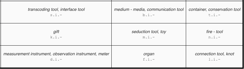 In Table 1 below, we have the detail of basic technical functions from the sixth column of Table 1 on the page about transversal concepts. It is the declension of « i » (doing) according to the nine concepts-letters of table 1 in this page.