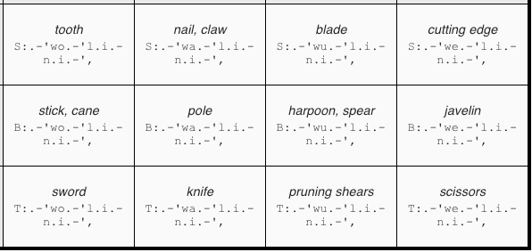 In Table 6, the first row is a variation on tooth and nail, the second row a variation on stick and pole, and the third a variation on knife and scissors.