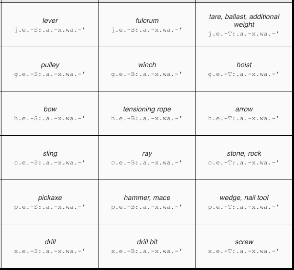 In Table 7, the first two rows present technical concepts related to the action of lifting or pulling, rows 3 and 4 present technical concepts related to the action of throwing, and rows 5 and 6 present concepts related to the action of drilling.